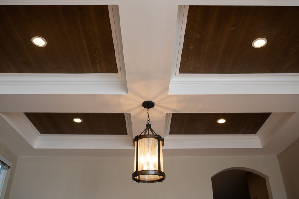 Take your interior design up a notch with a coffered ceiling. Inspired by Baroque architecture, a coffered ceiling has exposed or faux beams arranged in a grid pattern. Because of these beams, the ceiling appears to be indented.